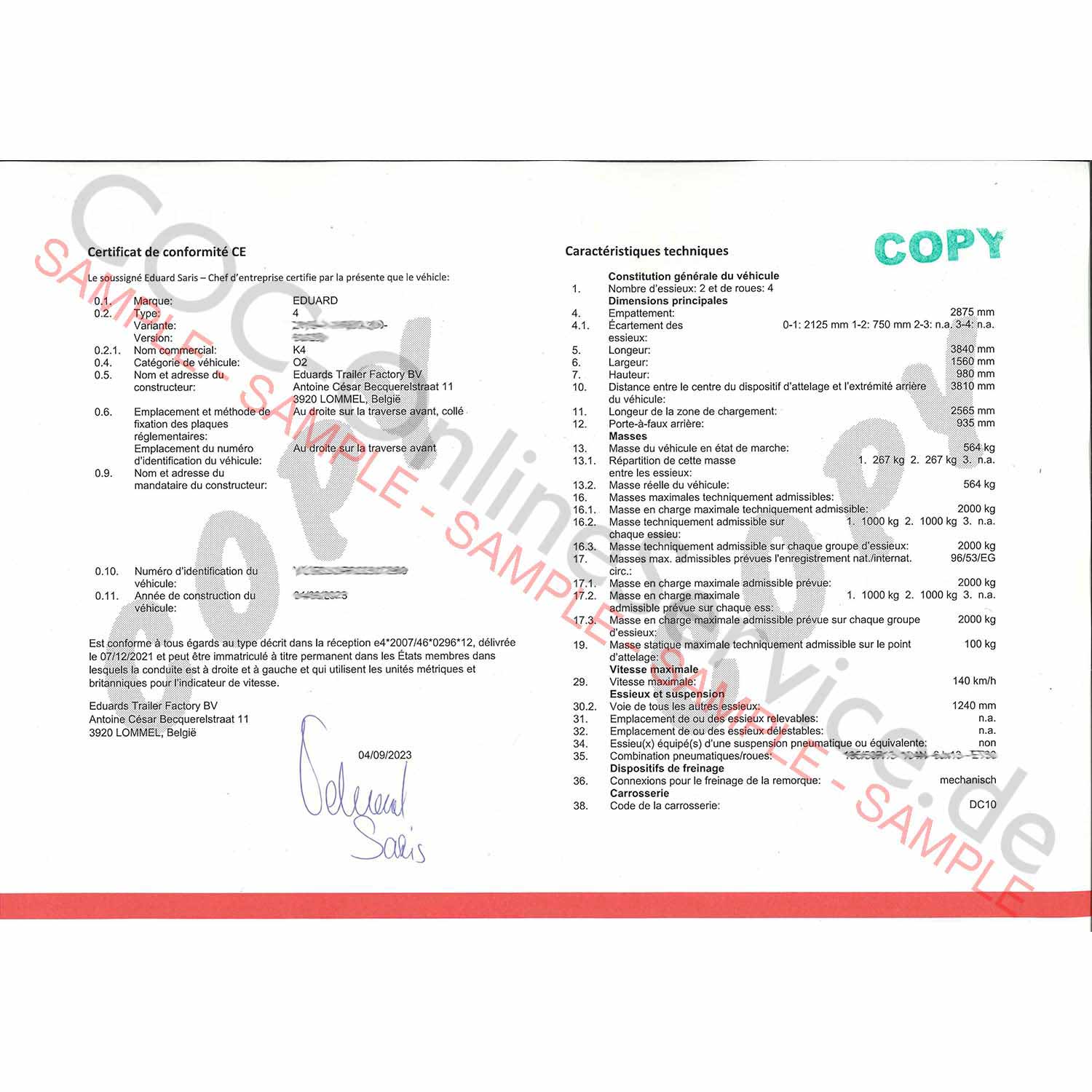 Sie erwerben ein authentisches Eduard-Konformitätszertifikat (COC) ausgestellt vom Fahrzeughersteller Eduards Trailer Factory BV, das die Übereinstimmung Ihres Fahrzeuges mit den europäischen Normen bescheinigt. Mit diesem COC-Dokument können Sie ihr Fahrzeug in allen Ländern des Europäischen Wirtschaftsraums (EWR) offiziell zulassen.